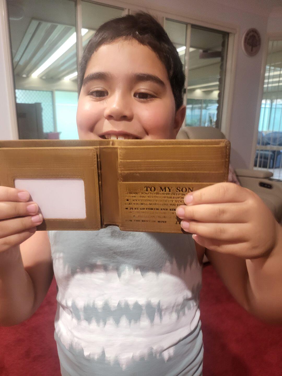The feel is like real leather, inside on both sides heaps of cardholder spots and for I/Ds, etc. My Son cried when it was read to him as he was reading at the same time and we both cried because it hit us both in the heart and then when we turned around Mummy was teary as well.